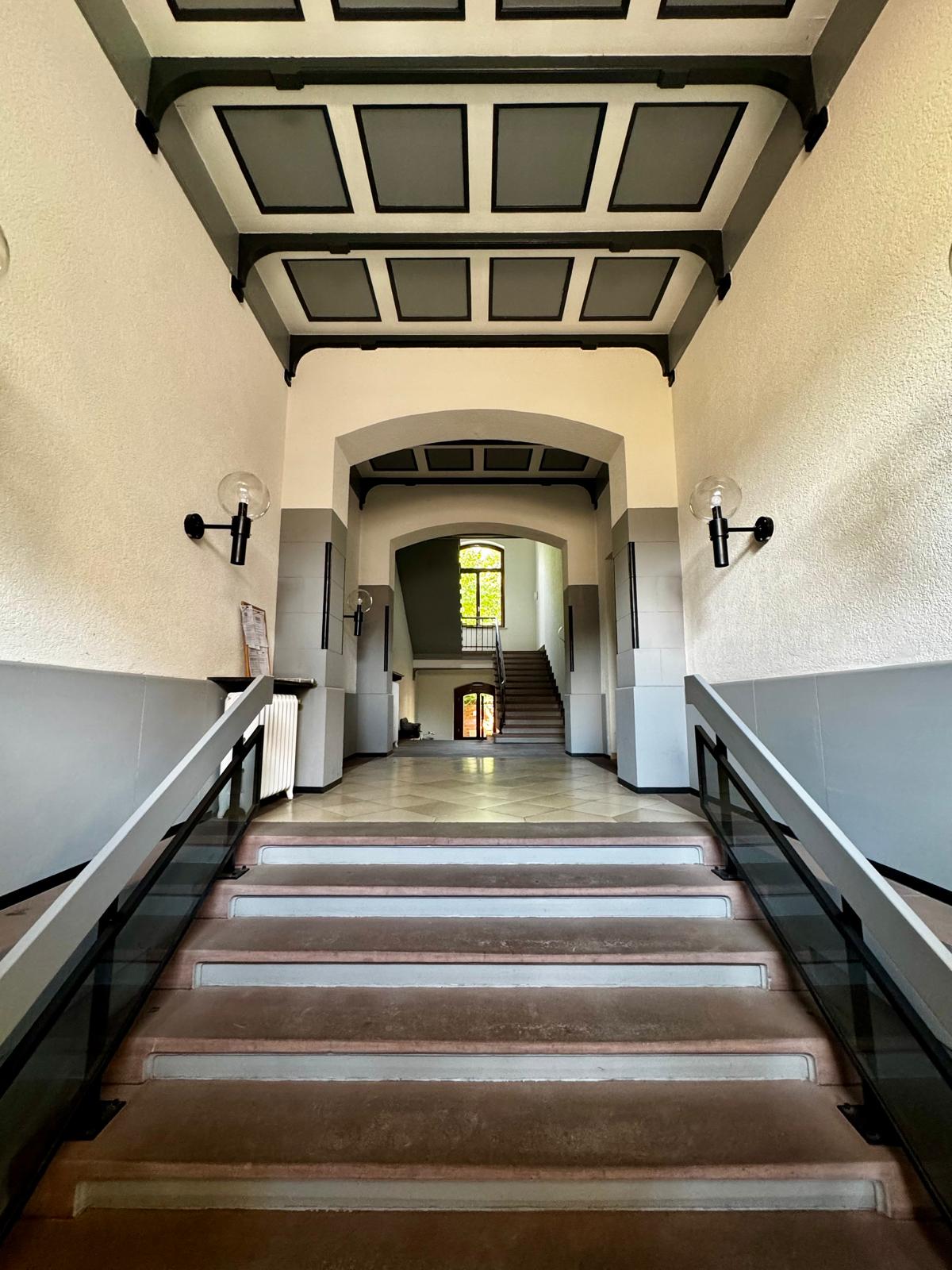 Das Gebäude betritt man durch die noch original erhaltene, massive zweiflüglige Eichentüre. Über einige Stufen erreichen Sie die ehemalige Eingangshalle der Bank. Diese stellt mit ihren hohen Decken und dem darin befindenden Treppenhaus das erste Highlight dar. Von hier sind es auch nur noch wenige Schritte zu Ihrem neuen Zuhause! Der Weg dort hin, also dieser Flur, ist ganz bewusst puristisch clean gehalten, um möglichst wenig Ablenkung zu bieten.