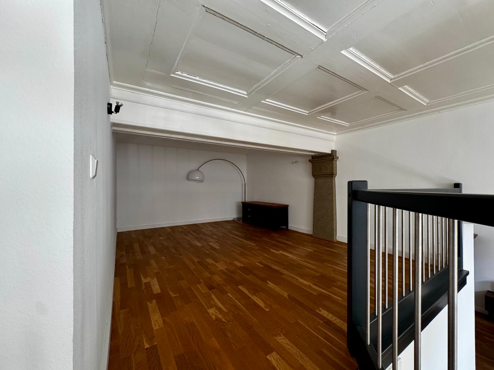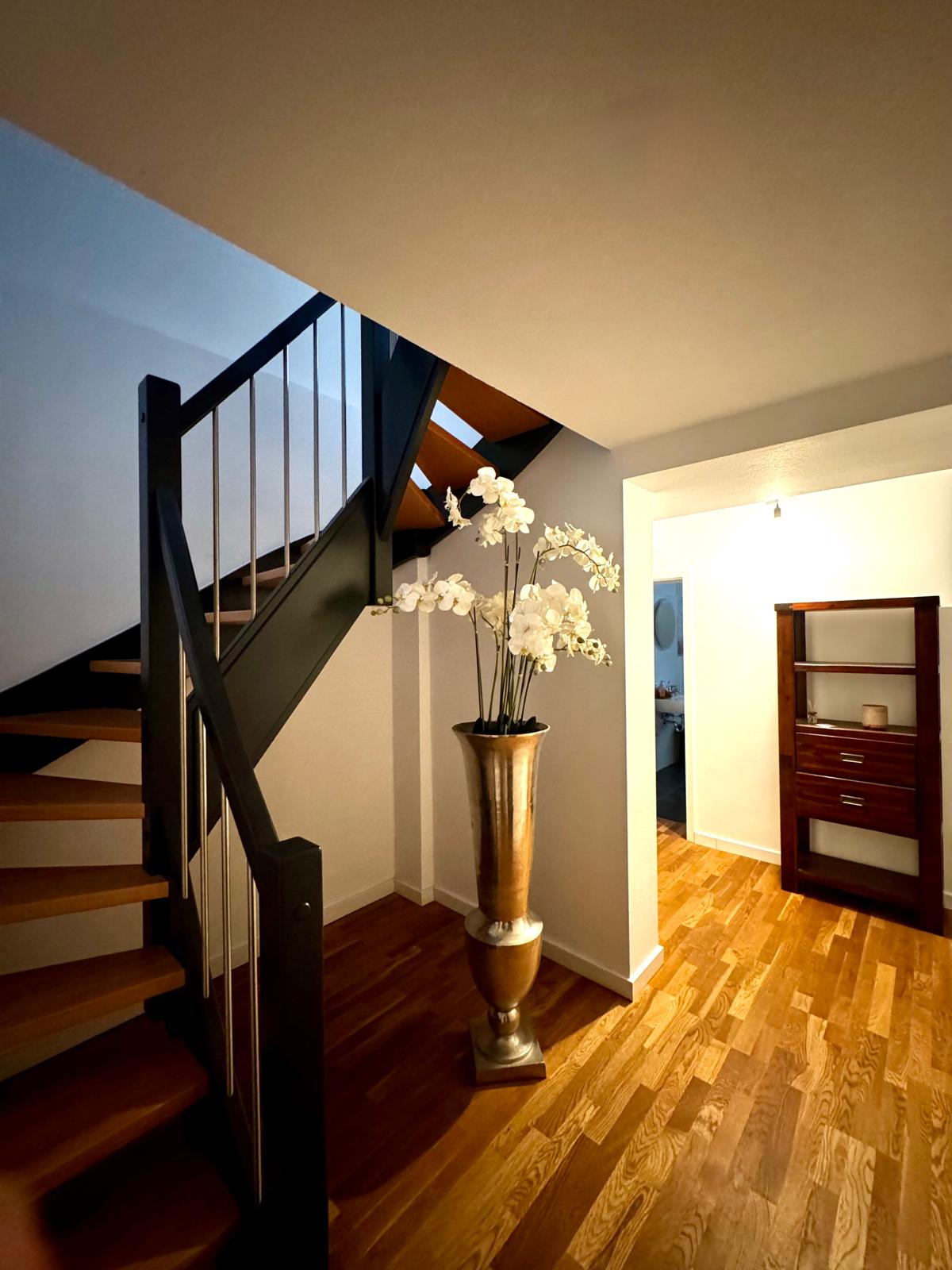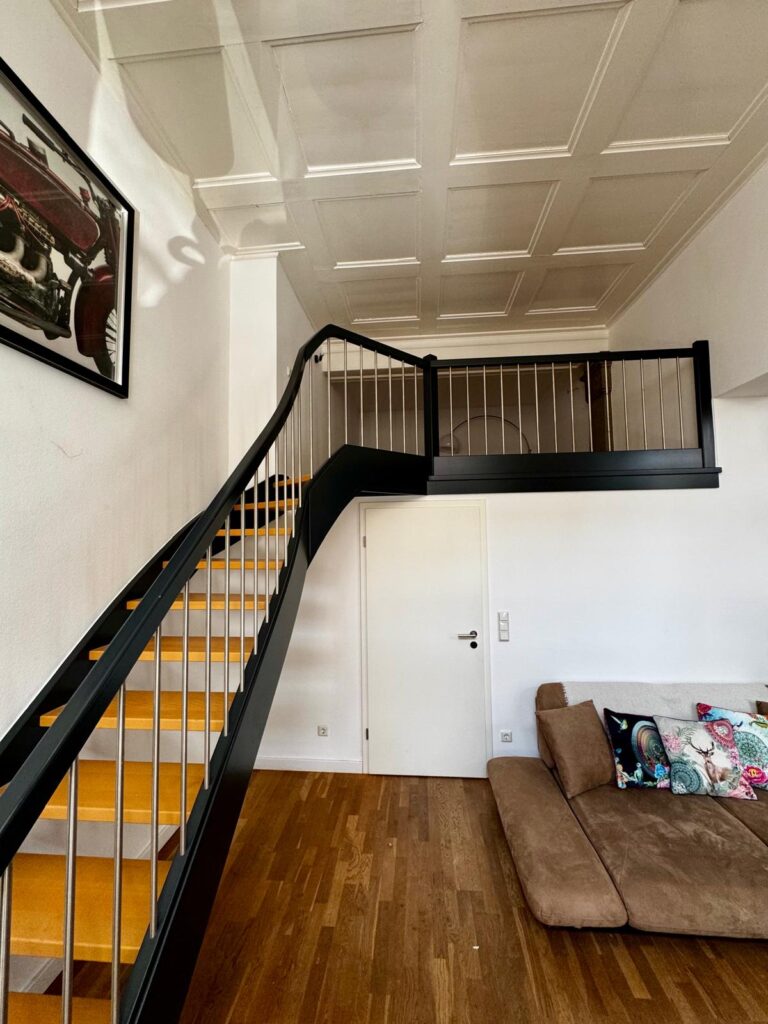 Eine moderne Treppe führt zu einer kleinen Empore, die mit 1,90 m Deckenhöhe Platz bietet für große, individuelle Gestaltung und ein Garant für Staunen, Fragen und Neid vieler Besucher sein wird!