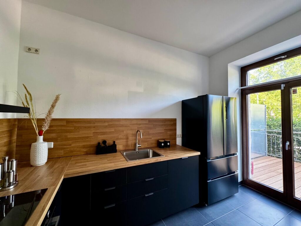 Geht man die Treppe wieder hinunter und durchschreitet den großzügigen Wohn- und Essbereich, schließt sich zur linken Seite die Küche an. Wahrscheinlich ist es sogar der sicherste Platz zum Kochen in Viersen, da wir uns hier im ehemaligen Tresorraum der Bank befinden. Also, auch wenn das mit dem Kochen noch nicht so klappt; hier sind Sie safe.