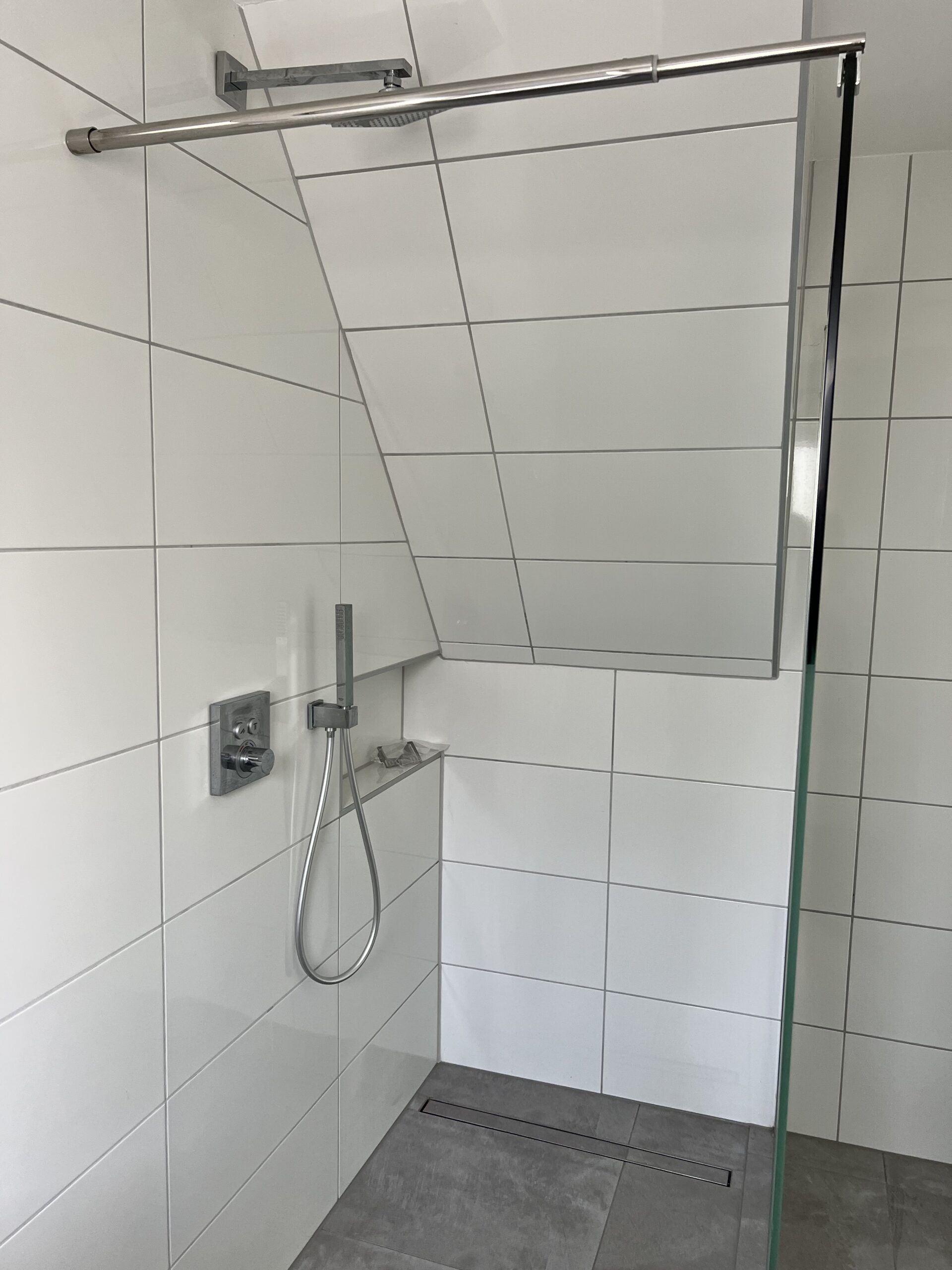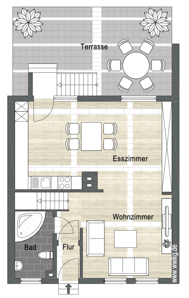 Das EG ist offen gestaltet und der großzügige Wohn-/Essbereich geht nahtlos in die sehr geräumige Küche über. Diese ist übrigens komplett eingerichtet, ebenfalls gut ausgestattet und verbleibt im Haus; dadurch wird dieser Bereich zum Mittelpunkt dieser Etage und verzaubert mit einem mediterranen Lebensgefühl, denn in der Küche werden die besten Partys gefeiert – Sie kennen das. Ergänzt wird das EG durch ein sehr ansprechendes, neues Badezimmer mit großzügiger, begehbarer Dusche (im Plan ist dort ne Wanne, das ist aber falsch) und chicen Badmöbeln.