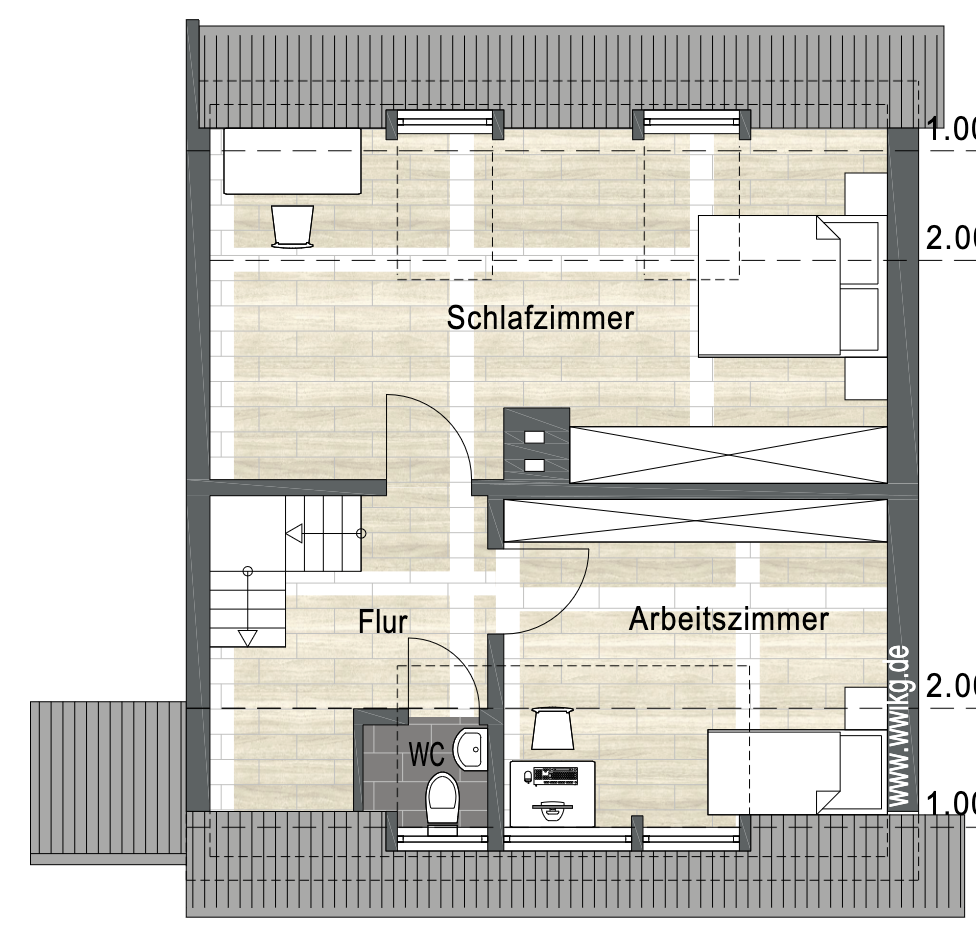 Im OG ist der Rückzugs- und Schlafbereich, der ergänzt wird durch ein ebenfalls komplett neues WC, damit nachts, wenn die Blase drückt, nicht durchs ganze Haus gelaufen werden muss. Zwei Zimmer sind vorhanden und können individuell genutzt werden; sie entscheiden, wie. Eine Ausbaureserve gibt es nicht, daher die Erläuterungen zu Beginn es Textes.